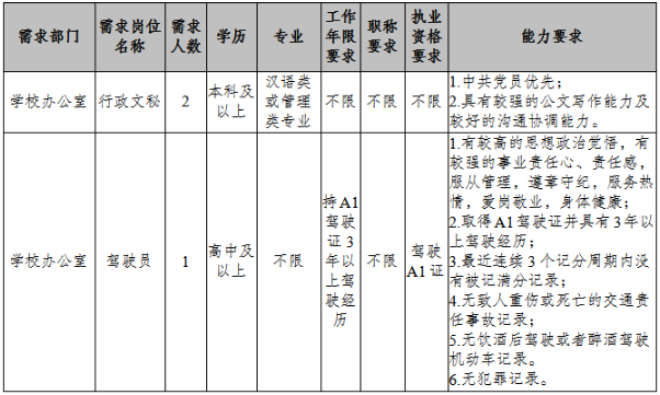 為適應(yīng)學(xué)校發(fā)展的需要,需面向社會誠聘2名行政人員及1名駕駛員,現(xiàn)將有關(guān)事項(xiàng)公告如下: